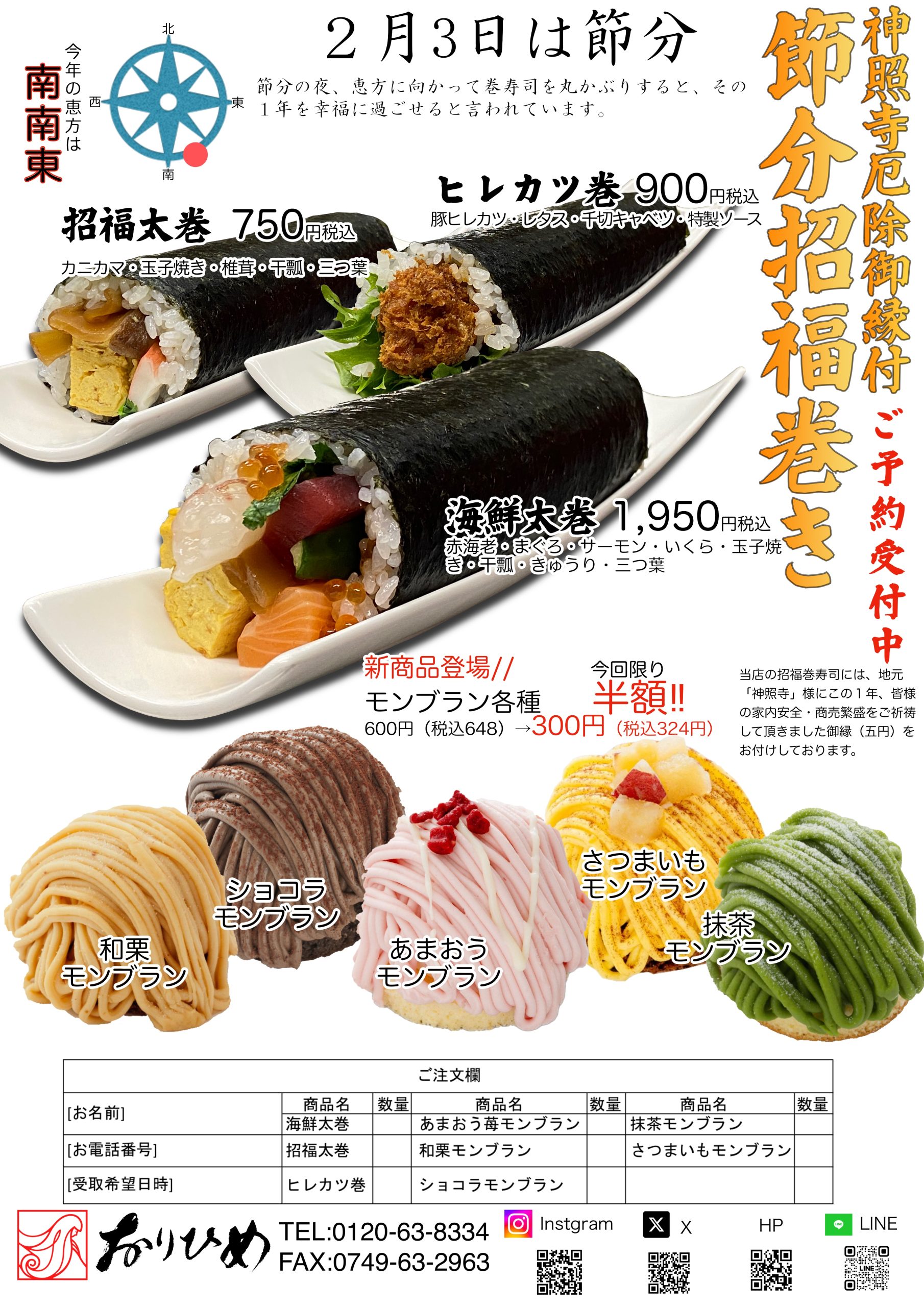 いつも当店をご利用いただき誠にありがとうございます!今年もやってきました!恵方巻きのご案内です!2026/2/3は節分になります。今年は、方位は南南東!今年から、初めてのモンブランを始めました!通常価格600円(税別)のところ、なんと半額の300円(税別)とさせていただいております!モンブランだけの注文でもOK!今後、一般メニューからご注文できるようにする予定でございます!皆様、巻き寿司後のお口直しに、また、巻き寿司の代わりに、モンブランケーキをかぶり付いてはいかがでしょうか?
